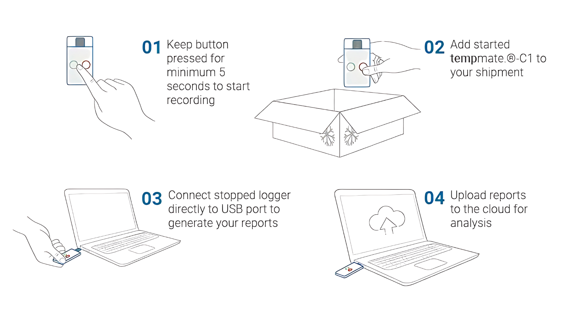 Tempmate-C1 kan registrera temperaturer så låga som -90°C, vilket ger en pålitlig överblick över dina torristransporter. För detta ändamål har hela enheten utvecklats på ett sådant sätt att varje enskild komponent, oavsett om det är elektroniken eller höljet, klarar extrema temperaturer från -90°C till +70°C utan problem.
